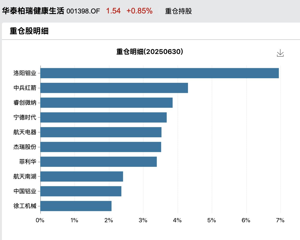 Wind显示,截至今年6月末,华泰柏瑞健康生活混合前十大重仓股分别为洛阳钼业、中兵红箭、睿创微纳、宁德时代、航天电器、杰瑞股份、菲利华、航天南湖、中国铝业、徐工机械。其中菲利华、航天南湖、徐工机械为二季度新进前十大重仓股。