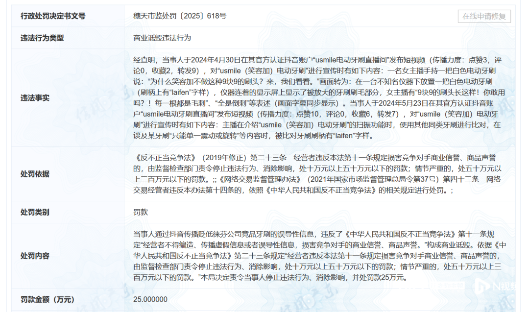 处罚信息显示,经查明,广州星际悦动股份有限公司于2024年4月30日、2024年5月23日均在短视频平台官方账户“usmile电动牙刷直播间”发布短视频,被认定构成商业诋毁。