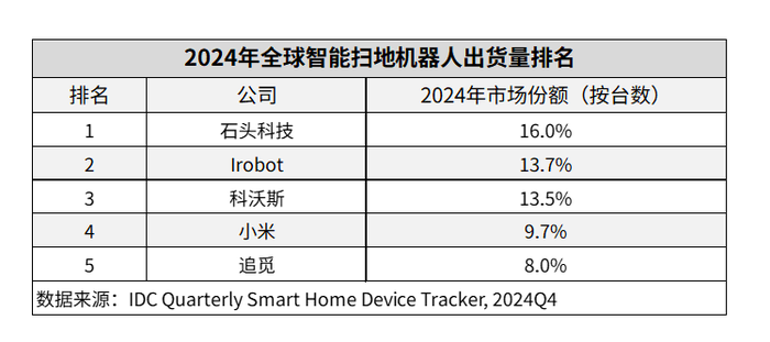 IDC去年发布的数据显示,全球智能扫地机器人出货量排名中,石头科技以16%的市场份额位列第一,科沃斯排名第三。但考虑到扫地机器人全年2060万台的出货量,石头科技和科沃斯之间的差距为50万台,单论数量其差距也并不明显。