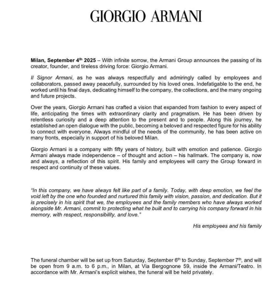 阿玛尼9月4日公告称,意大利时装设计师乔治·阿玛尼(Giorgio Armani)离世,享年91岁,“阿玛尼怀着无限悲痛宣布其缔造者、创始及不懈推动者乔治·阿玛尼的逝世。”