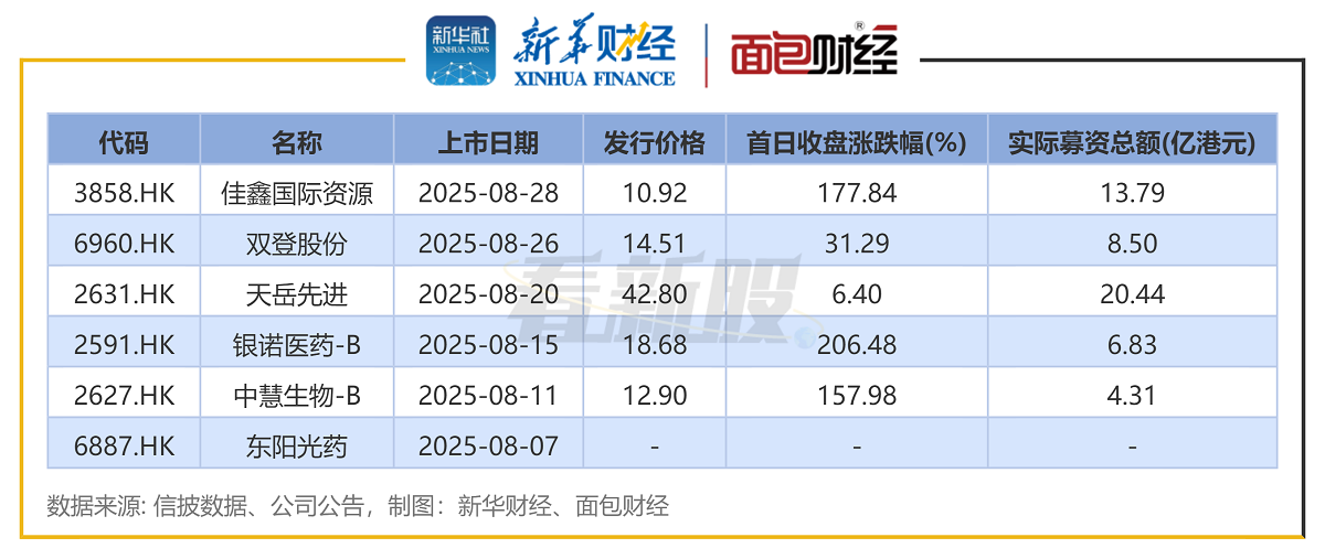 8月上市新股中,天岳先进募资总额达20.44亿港元,规模最大。佳鑫国际资源紧随其后,募集约13.79亿港元。另外,双登股份、银诺医药-B、中慧生物-B募资低于10亿港元。东阳光药因采用介绍上市,通过吸收合并子公司东阳光长江药业实现整体上市,无募集资金。