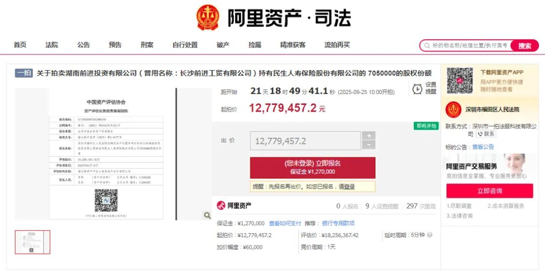9月3日,《国际金融报》记者从阿里资产司法拍卖平台获悉,民生人寿保险股份有限公司(下称“民生人寿”)705万股股份将于9月25日公开拍卖,起拍价为1277.95万元,在评估价1825.64万元的基础上打了七折。