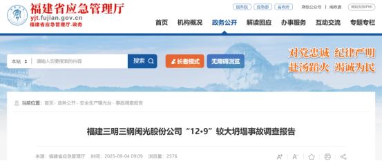 9月4日,福建省应急厅发布福建三明三钢闽光股份公司“12·9”较大坍塌事故调查报告:2024年12月9日19时14分许,福建省三明市三元区福建三钢闽光股份有限公司铁前事业部烧结作业区工人在4号料仓内违规清除悬挂料,作业中突发悬挂料坍塌事故,造成3人死亡,直接经济损失682.76万元。