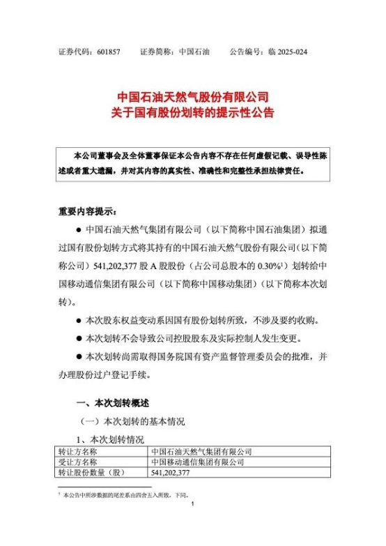 据公告,中国石油的控股股东——中国石油天然气集团有限公司(简称中国石油集团)拟通过国有股份划转方式,将其持有的中国石油的541202377股A股股份(占中国石油总股本的0.3%)划转给中国移动通信集团有限公司(简称中国移动集团),转让价格为0元。