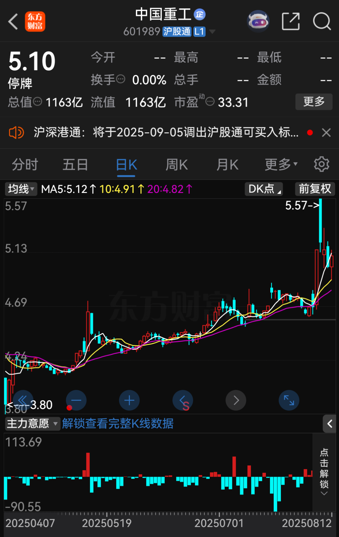 同时,中国重工计划自9月5日起终止上市,并注销法人资格。据悉,上述交易已获中国证监会批复,并且上交所出具了《关于中国船舶重工股份有限公司股票终止上市的决定》。
