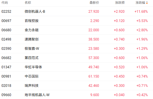 受益于多重利好,港股机器人概念股走强。截至发稿,维创机器人-B(02252.HK)、首程控股(00697.HK)、金力永磁(06680.HK)、速腾聚创(02498.HK)分别上涨11.68%、5.53%、2.80%、1.48%。