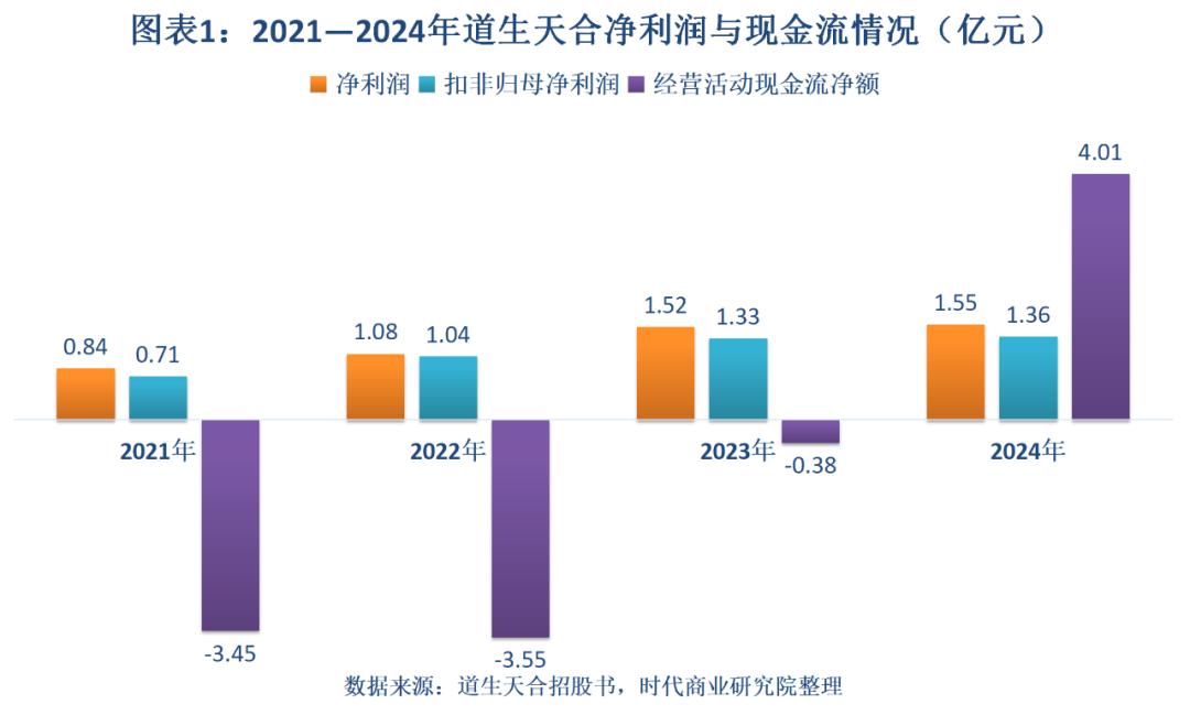 时代商业研究院发现,2021—2024年(报告期),道生天合的营收停滞在33亿元左右,但是净利润持续上升,年复合增长率超22%,或与该公司毛利率提升、非经常性损益较高有关。不过,2021—2023年,道生天合经营活动产生的现金流持续净流出,净现比持续为负,盈利质量待考。