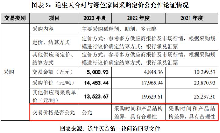 对于2021—2022年对绿色家园采购单价偏低的问题,道生天合表示,主要是由于采购期间和采购原料品种差异,具有合理性。而对于2023年采购单价偏高的情况,道生天合仅表示定价公允,但是未说明原因。