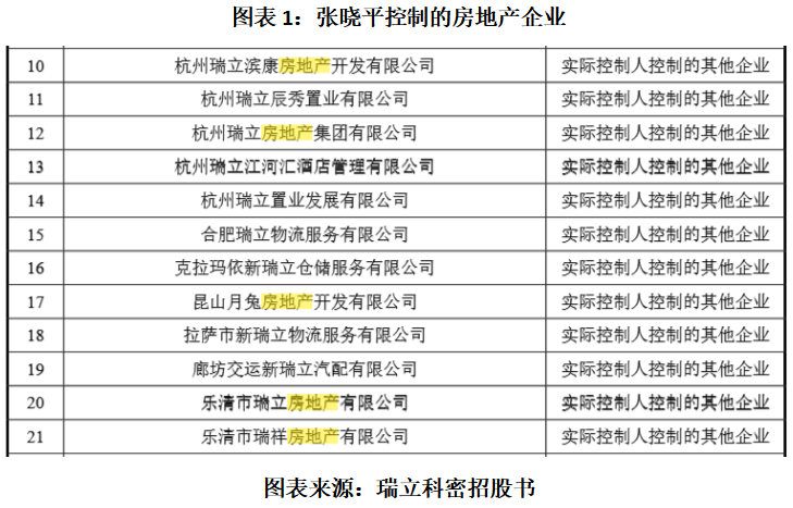 尽管2020年瑞立集团已通过私有化合并的方式从美股退市,但是目前除了瑞立科密,张晓平一家还控制着由超160家企业构成的“瑞立系”。招股书显示,其资本版图横跨房地产开发、物流、酒店管理、仓储、股权投资、文教、贸易、汽车零部件等多个行业。