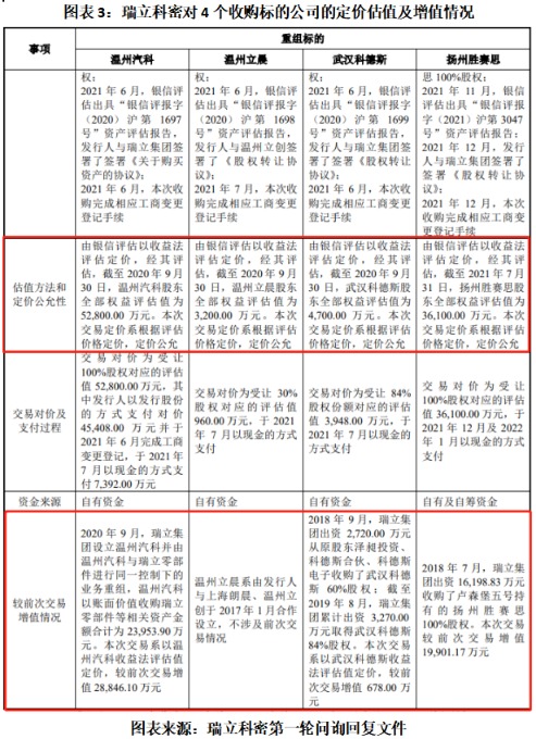 瑞立科密在第一轮问询回复文件中称,本次重组中,公司收购的4家标的公司股权较前次交易价格及净资产账面价值存在增值主要系因交易背景、交易时点、定价方式等存在差异所致。其中,瑞立科密称温州汽科的资产属于市场应用前景广、经营良好的盈利性资产,因此该公司于2021年以收益法评估值收购温州汽科,交易价格较其净资产账面值存在差异具备合理性。