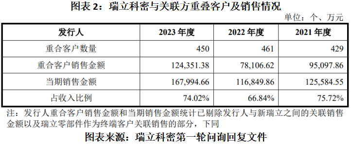 同期,瑞立科密与关联企业重叠客户的数量分别为429家、461家、450家,瑞立科密对重叠客户的销售收入分别为9.51亿元、7.81亿元、12.44亿元,占同期收入的比例分别为75.72%、66.84%、74.02%。