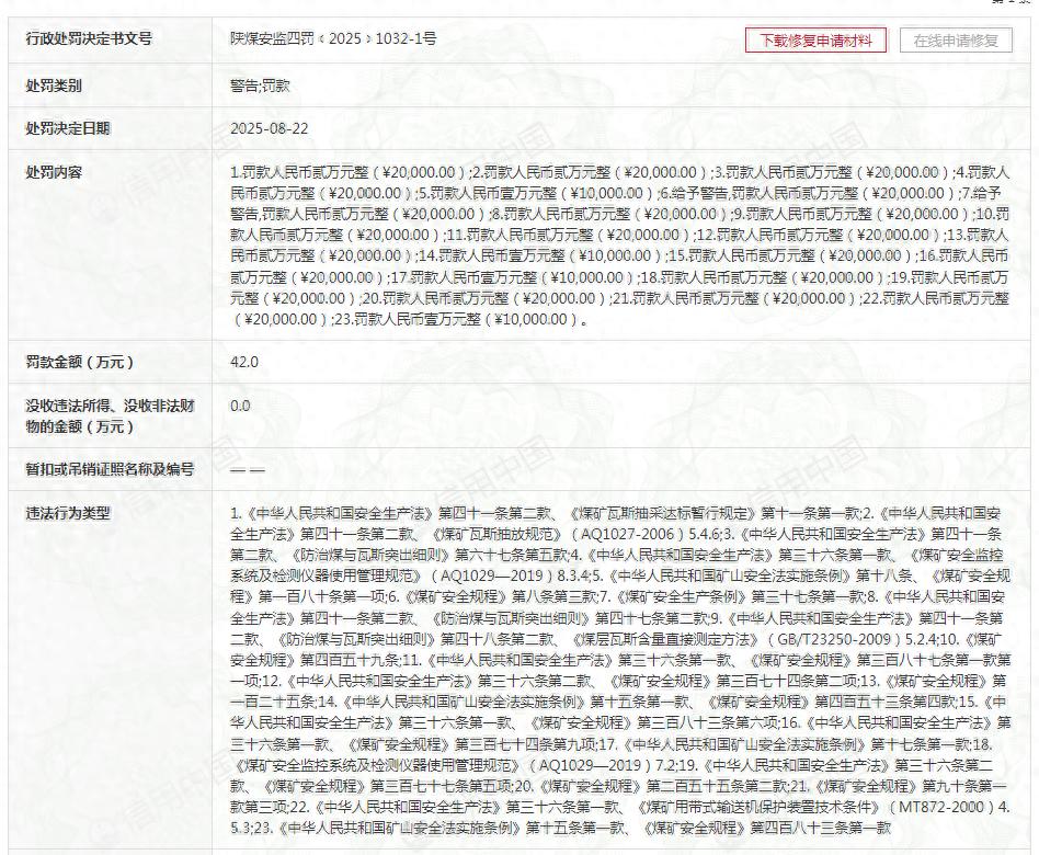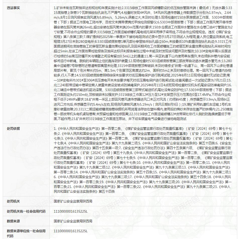 近日,信用中国公示了陕西陕煤韩城矿业有限公司桑树坪煤矿的行政处罚决定。行政处罚决定书文号 陕煤安监四罚﹝2025﹞1032-1号显示,陕西陕煤韩城矿业有限公司桑树坪煤矿违法事实为矿井未制定瓦斯抽采达标规划和年度实施计划、3315综放工作面回风顺槽敷设的低压抽放管路末端(最低点)无放水器、3315底抽巷上联巷3个瓦斯抽放钻孔封孔不严漏气等23项,国家矿山安全监察局陕西局依据《中华人民共和国安全生产法》相关法规,对其23项违法内容分别处罚款处罚,合计罚款42万元。