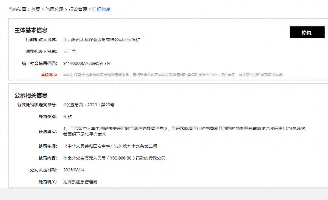 近日,信用山西公示了山西汾西太岳煤业股份有限公司太岳煤矿的行政处罚决定。行政处罚决定文书号:(沁)应急罚﹝2025﹞第23号显示,山西汾西太岳煤业股份有限公司太岳煤矿违法事实为1、二部架空人车中间段未安装延时启动声光预警信号;2、五采区轨道下山控制局扇Ⅱ回路的馈电开关辅助接地线采用1.5*4电缆线,截面积不足10平方毫米。