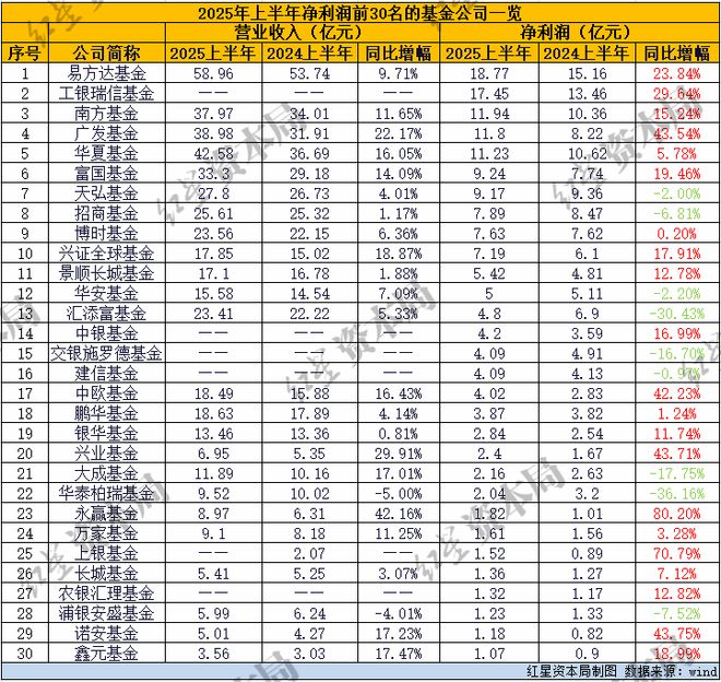 Wind数据显示,共有5家头部公募上半年净利润超10亿元。易方达基金以18.77亿元的净利润稳坐第一,营收同样领先,为58.96亿元;然后依次是工银瑞信基金(17.45亿元)、南方基金(11.94亿元)、广发基金(11.8亿元)、华夏基金(11.23亿元)。