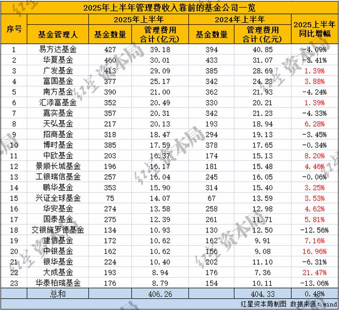 具体来看,上半年有21家公募管理费收入超过10亿元,其中8家超过20亿元。2024年同期,管理费收入超过10亿元、20亿元的分别为20家、7家。