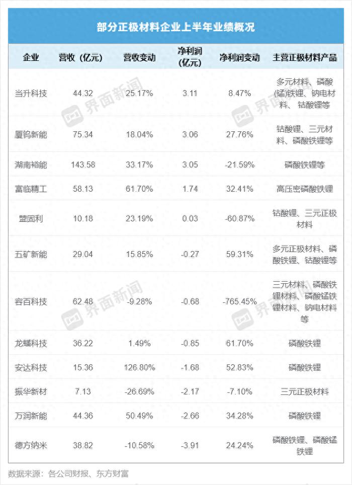 据界面新闻统计的12家锂电池正极材料企业中,仅5家实现盈利,其余均陷入亏损。