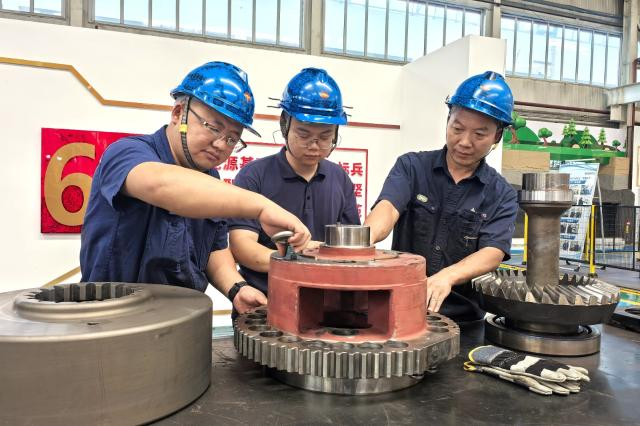 杨魁带领的三人小组正在观察行星架表面有无划痕。
