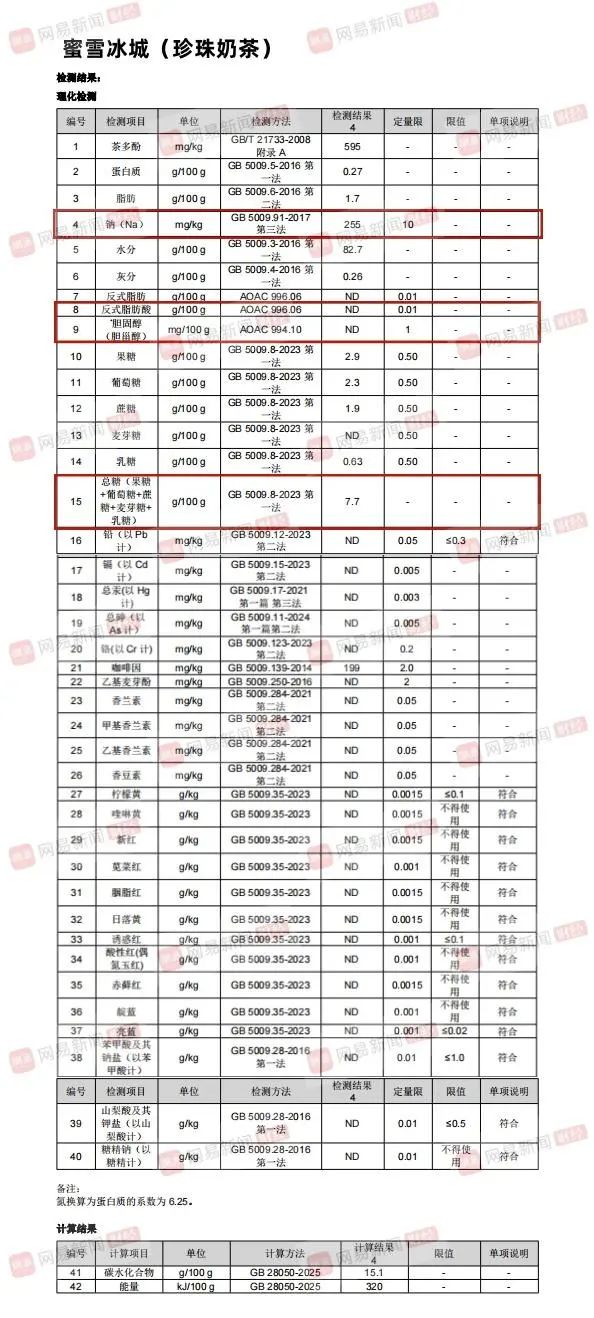 此次网易财经送检的奶茶品牌和产品分别为喜茶(烤黑糖波波牛乳茶)、奈雪(金色山脉珍珠奶茶)、蜜雪冰城(珍珠奶茶)、茉莉奶白(栀子奶白)、霸王茶姬(伯牙绝弦)、爷爷不泡茶(空山栀子)、沪上阿姨(浅浅清茉莉针王清乳茶)、茶百道(招牌芋圆奶茶)。