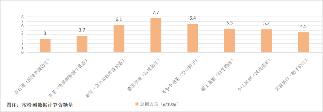 检测报告显示,8款产品总糖含量均不低。其中含糖量最低的是茶百道的招牌芋圆奶茶,总糖含量为3.0g/100g;最高的是蜜雪冰城的珍珠奶茶,总糖含量为7.7g/100g。以蜜雪冰城珍珠奶茶(大杯650ml)计算,其单杯含糖量达50.82克,以4.5g/块方糖计算,相当于11.3块方糖,已超过《中国居民膳食指南》每日添加糖建议上限(50g)。