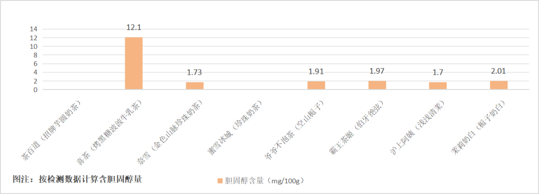 除反式脂肪酸外,本次送检同时发现,喜茶、奈雪等5款产品检出胆固醇,含量区间为1.73-12.1mg/100g。其中喜茶烤黑糖波波牛乳茶(12.1mg/100g)显著高于其他产品。