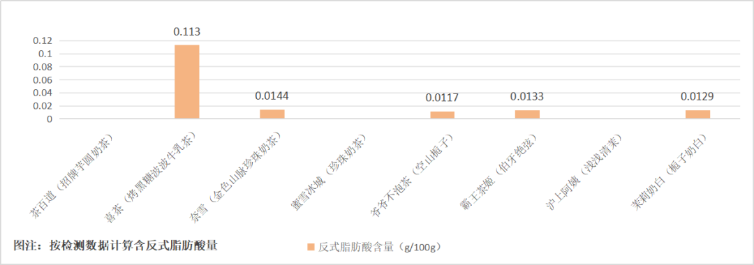 随着近几年消费者越来越关注自身健康,反式脂肪酸被越来越多的消费者熟知。而在此次检测中,喜茶(烤黑糖波波牛乳茶)、奈雪(金色山脉珍珠奶茶)、茉莉奶白(栀子奶白)、霸王茶姬(伯牙绝弦)、爷爷不泡茶(空山栀子)被检出反式脂肪酸。