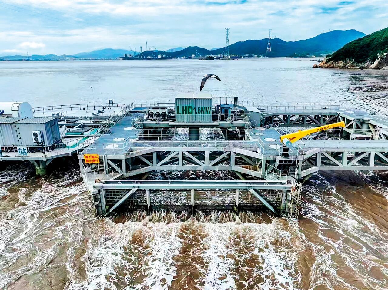 潮流能工程则一般坐落于岛屿峡间水流速度高的地方,对近海开发影响较小。浙江大学机械工程学院教授、机电控制技术与工程研究所所长刘宏伟向《中国新闻周刊》介绍,潮流能规律性强,可借鉴风电原有的技术储备,发展最为快速。潮流能受海上天气影响也较小,林东表示,7月底的台风天里,LHD的日发电功率波动不到10%。