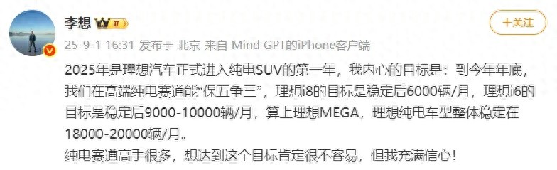 2025年是理想汽车正式进入纯电SUV的第一年,我内心的目标是:到今年年底,我们在高端纯电赛道能“保五争三”,理想i8的目标是稳定后6000辆/月,理想i6的目标是稳定后9000-10000辆/月,算上理想MEGA,理想纯电车型整体稳定在18000-20000辆/月。