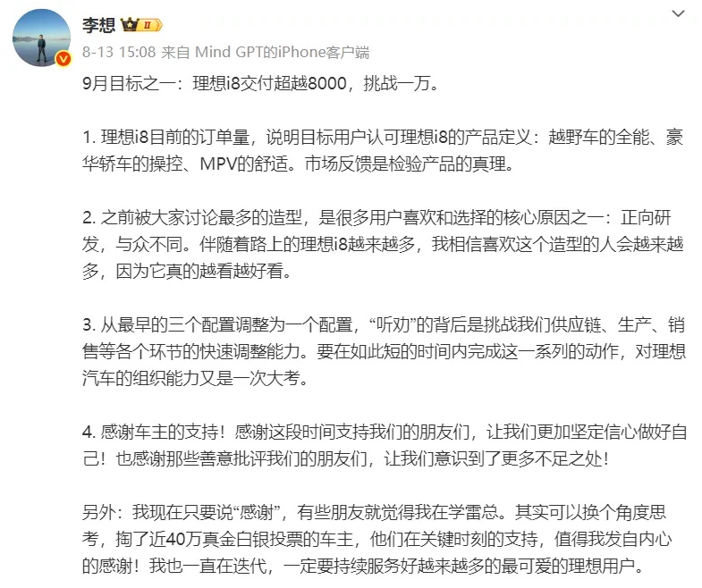 8月13日,李想曾发文谈及理想i8今年9月的目标是交付超8000,挑战1万。