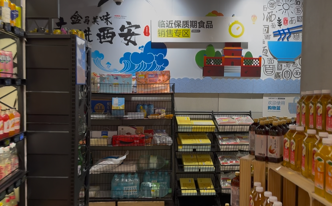 第三家:位于西安市长安北路的盒马鲜生南稍门店。该店也设有临近保质期商品销售专区,在一个通道边的角落里,因为墙上有各种宣传盒马美食的字和图案,弱化了夹在其中的“临近保质期食品销售专区”的牌子。此处的商品种类较多,有粮油类、饮品、休闲食品、奶制品等,每个临期商品的外包装上都另外打上享受优惠价的条形码,并标注上所打的折扣。