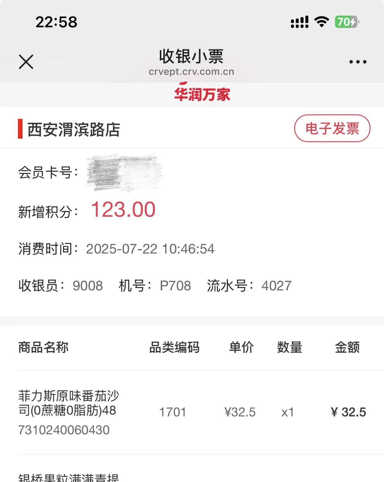 王先生告诉记者,7月22日上午,他在西安市未央区渭滨街上的华润万家购物中心买了一瓶番茄酱以及餐巾纸、酸奶等日用品,共花费123余元。回到家,他在清洗外包装时,才发现番茄酱只有20多天就过期了。“我家就孩子吃东西会蘸这个酱,这瓶480克,保质期到期也吃不完!”