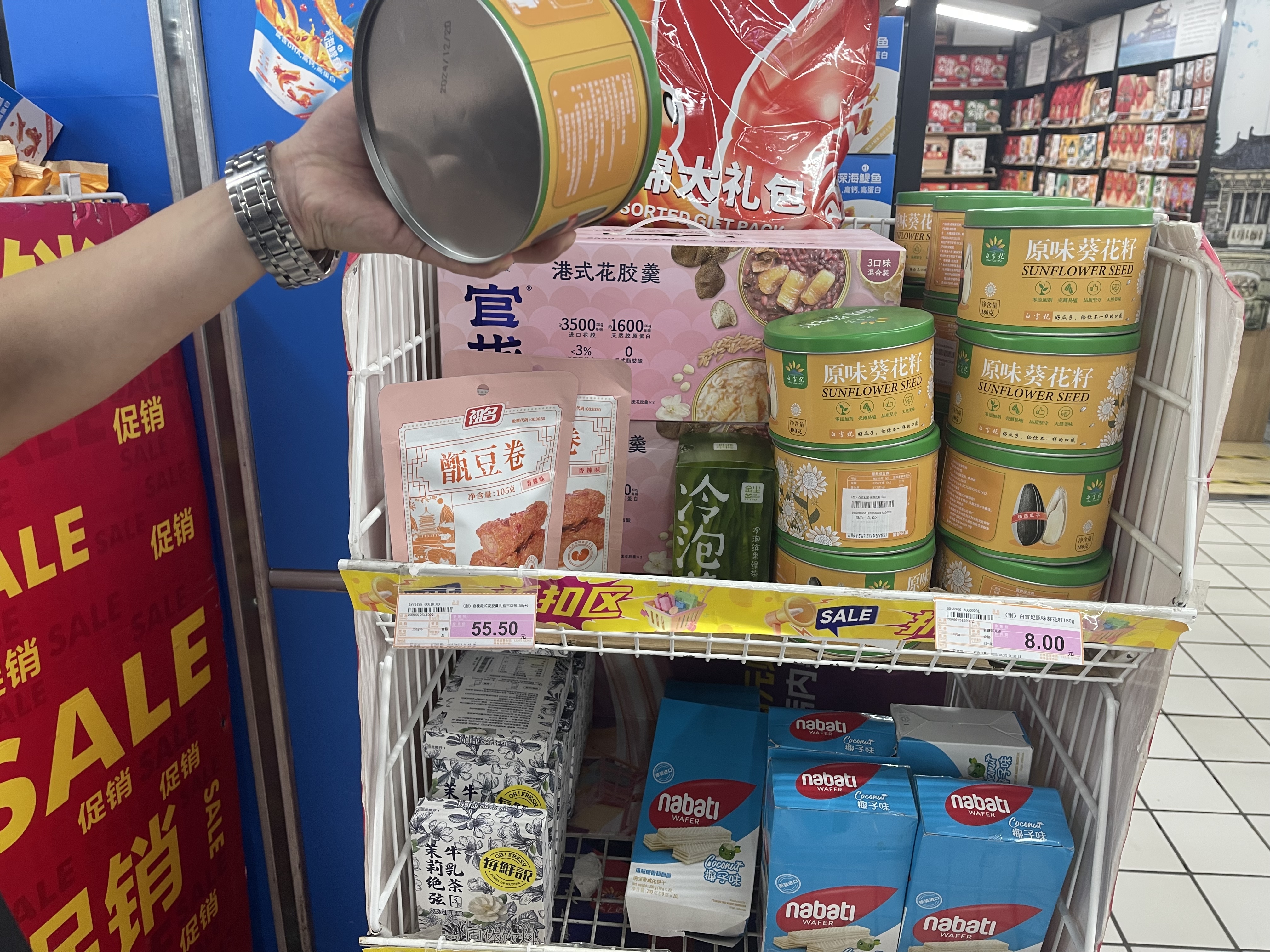 第八家:华润万家西影路店。记者走访,没有发现有醒目专柜,经工作人员指引,记者在休闲食品区域找到了一个小货架,但此处并未有临期商品提示语,只写着折扣区。工作人员说,凡不是商品原价签,就是临期要处理的,他们会在原有的条形码上再贴一个优惠条形码,临近保质期两三个月的,以折扣的形式销售,没有专门标注临期商(食)品的提醒。记者查看发现,此处有临近保质期的食品,外包装也没有贴上折扣价签。工作人员解释,可能是贴上去的价签掉了,这种掉了价签的,如果拿去在服务台结账,还是会以原价结算的,所以消费者购买时需要留心查看。