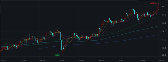 白银兼具贵金属和工业金属属性,业内认为,美联储降息预期和光伏需求爆发共同驱动白银价格走高。在突破40美元关键阻力位后,白银价格波动加剧,上方目标直指2011年的高点49.8美元。当前,白银价格仍处于补涨阶段。