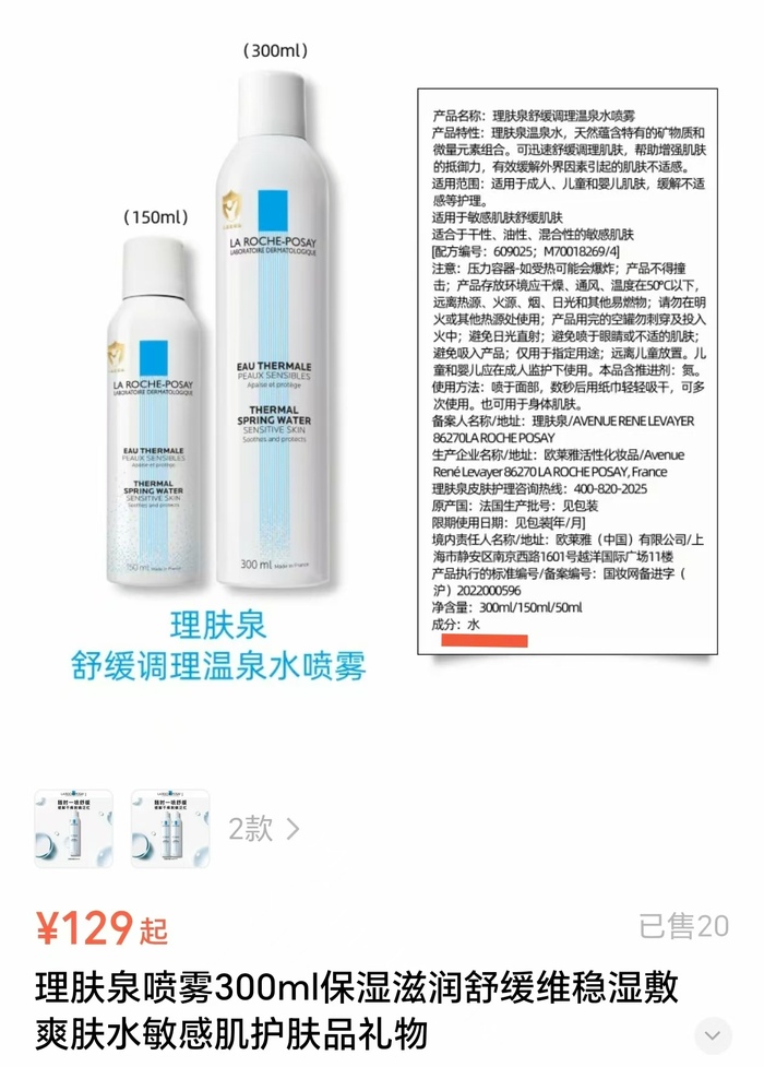 9月2日,界面新闻在理肤泉线上自营店查询发现,该款喷雾的成分确实只有“水”,150ml的售价是119元,300ml的售价为129元起。产品特性一栏介绍称,该喷雾天然蕴含特有的矿物质和微量元素组合,可迅速舒缓调理肌肤,帮助增强肌肤的抵御力,缓解外界因素引起的肌肤不适感。