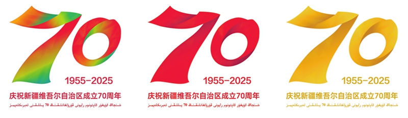 新疆维吾尔自治区成立70周年庆祝活动标识主体为律动扭转的数字“70”,取丝路沙漠绿洲之绿、石榴花之红与胡杨林之黄为主色,展现出新疆维吾尔自治区的锦绣山川,红黄绿色渐变交织出璀璨的文化脉络,象征70年来新疆各族人民在中国共产党的领导下,在伟大祖国的怀抱中,同心协力、砥砺奋进,在中国式现代化进程中更好建设美丽新疆的蓬勃朝气。“1955—2025”代表新疆维吾尔自治区成立70周年。标识凸显中华民族精神,反映新疆历史底蕴,营造出喜庆、热烈、祥和的氛围。同时附两款单色标识。