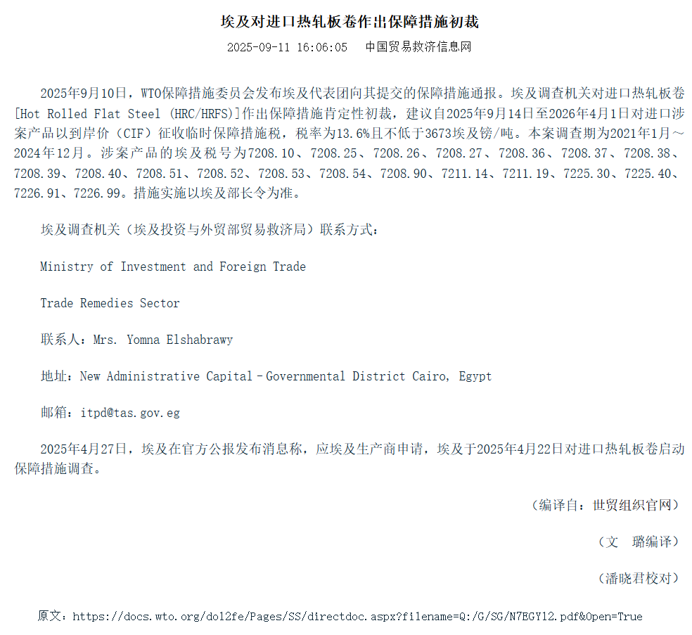 近期,据中国贸易救济信息网显示,9月10日,WTO保障措施委员会发布埃及代表团向其提交的保障措施通报。埃及调查机关对进口热轧板卷作出保障措施肯定性初裁,建议自2025年9月14日至2026年4月1日对进口涉案产品以到岸价(CIF)征收临时保障措施税,税率为13.6%且不低于3673埃及镑/吨。本案调查期为2021年1月~2024年12月。措施实施以埃及部长令为准。