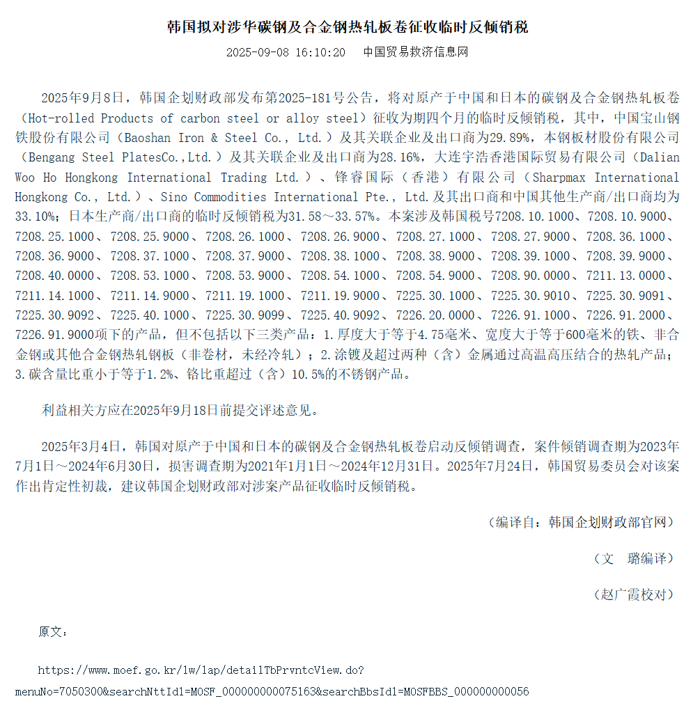 近期,据中国贸易救济信息网显示,9月8日,韩国企划财政部发布公告,将对原产于中国和日本的碳钢及合金钢热轧板卷征收为期四个月的临时反倾销税,其中,中国宝山钢铁股份有限公司及其关联企业及出口商为29.89%,本钢板材股份有限公司及其关联企业及出口商为28.16%,大连宇浩香港国际贸易有限公司、锋睿国际(香港)有限公司、Sino Commodities International Pte., Ltd.及其出口商和中国其他生产商/出口商均为33.10%;日本生产商/出口商的临时反倾销税为31.58~33.57%。不包括以下三类产品:1.厚度大于等于4.75毫米、宽度大于等于600毫米的铁、非合金钢或其他合金钢热轧钢板(非卷材,未经冷轧);2.涂镀及超过两种(含)金属通过高温高压结合的热轧产品;3.碳含量比重小于等于1.2%、铬比重超过(含)10.5%的不锈钢产品。