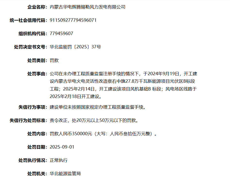 近日,国家能源局资质和信用信息系统信息显示,内蒙古华电辉腾锡勒风力发电有限公司因公司在未办理工程质量监督注册手续的情况下,于2024年9月19日,开工建设内蒙古华电火电灵活性改造察右中旗27.8万千瓦新能源项目光伏区B标段工程;2025年2月14日,开工建设该项目风机基础B 标段;风电场区线路于2025年2月18日开工建设。被华北能源监管局罚款人民币350000元(大写:人民币叁拾伍万元整)。