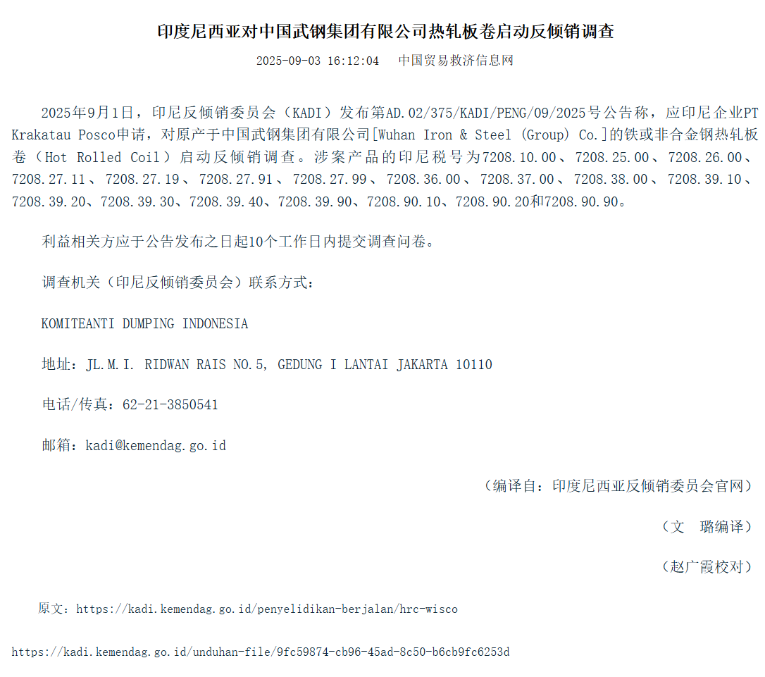 近期,据中国贸易救济信息显示,9月1日,印尼反倾销委员会发布公告称,应印尼企业PT Krakatau Posco申请,对原产于中国武钢集团有限公司的铁或非合金钢热轧板卷启动反倾销调查。并表示,利益相关方应于公告发布之日起10个工作日内提交调查问卷。