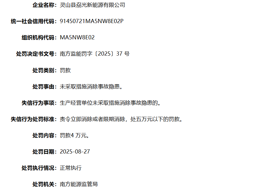 近日,国家能源局资质和信用信息系统信息显示,灵山县劦光新能源有限公司因未采取措施消除事故隐患。被南方能源监管局罚款4 万元。