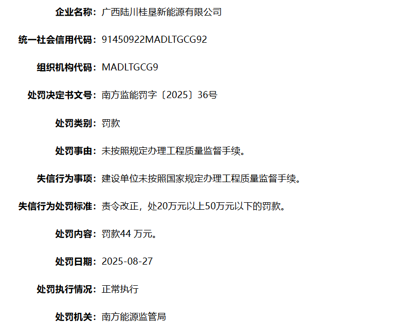 近日,国家能源局资质和信用信息系统信息显示,广西陆川桂垦新能源有限公司因未按照规定办理工程质量监督手续。被南方能源监管局罚款44万元。