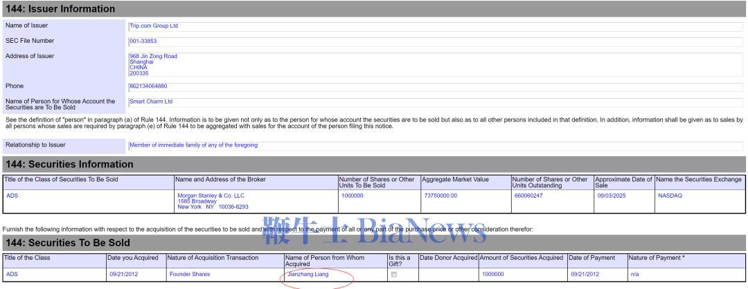 据携程递交给美国SEC的文件显示,携程联合创始人、董事局主席梁建章计划出售公司100万ADS,价值7375万美元(约5.27亿元)。