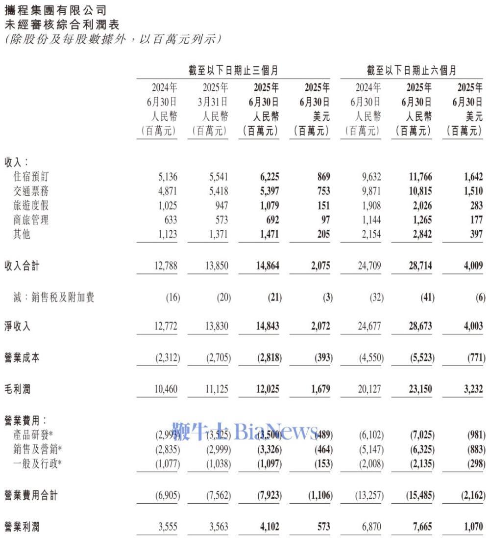 财报显示,携程2025年上半年营收为287亿元(约40亿美元),经营利润为76.65亿元(约10.7亿美元),净利为91.94亿元(约12.83亿美元)。