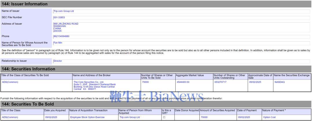 携程联合创始人、总裁范敏也递交文件,计划出售7万股ADS,价值454.44万美元(约3242万美元)。