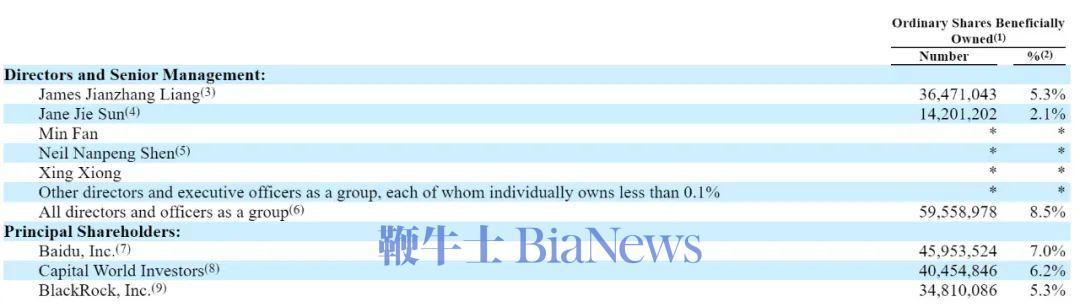 百度持股7%,Capital World Investors持股为6.2%,BlackRock持股为5.3%,范敏持股已不足1%。