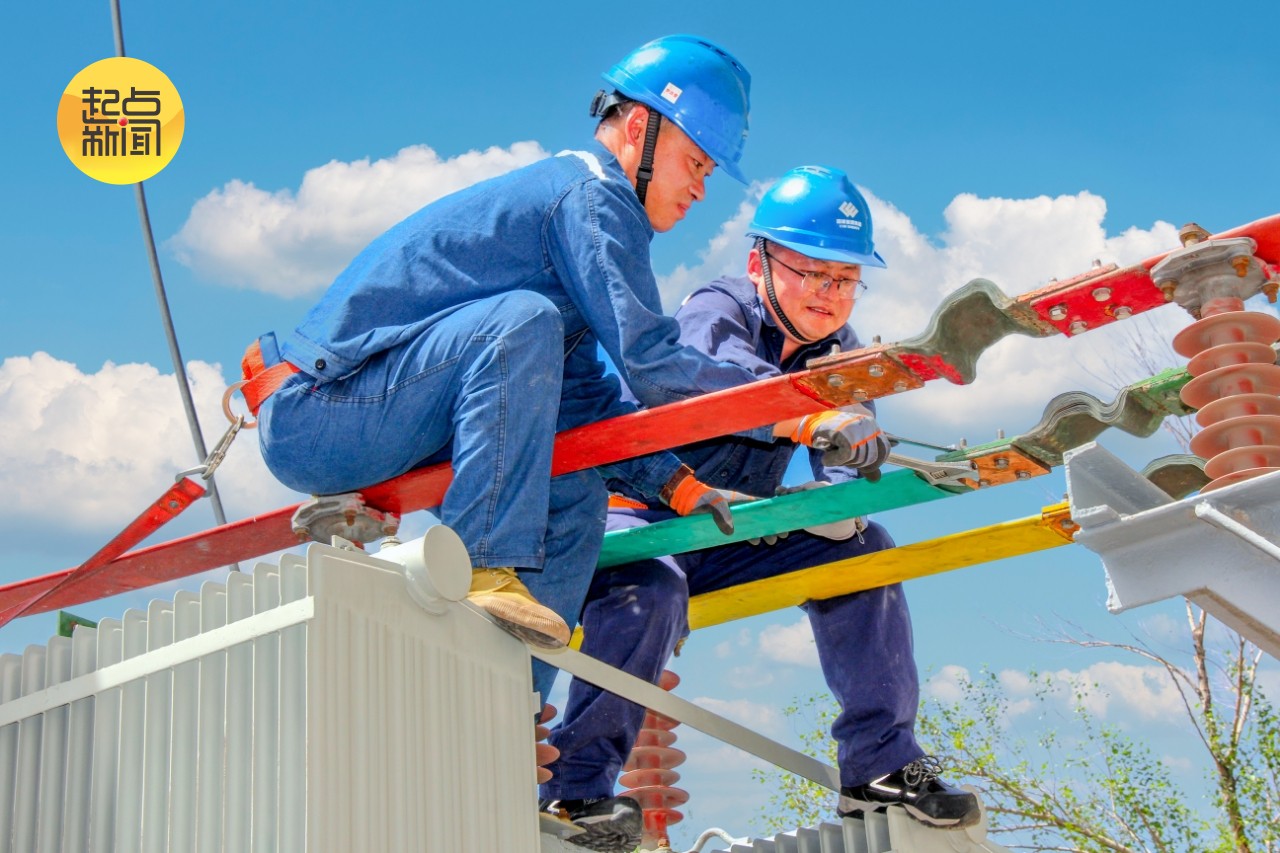 图11:烈日下,神东供电中心电气检修一队队长王波和检修工郭将正在更换活鸡兔35千伏变电站变压器母排锈蚀螺丝,确保生产供电安全。