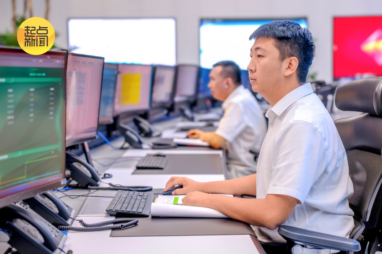 图5:夜晚,神东煤炭总调度室灯光通明,调度员李帅正在紧盯电脑屏幕,监控矿井生产设备的运行状态,确保公司煤炭生产计划任务的顺利执行。