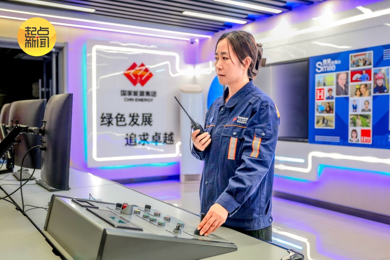 图6:夜晚的神东洗选中心大柳塔选煤厂装车车间里,装车工何秋霞正在操作快速装车系统,精准地将滚滚乌金装满每节车厢。