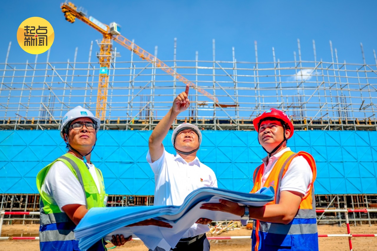 图10:在国家矿山应急救援神华神东实训基地施工现场,神东工程项目公司公共建筑项目部梁瑞正在对照图纸,向施工方人员强调工程施工要求。