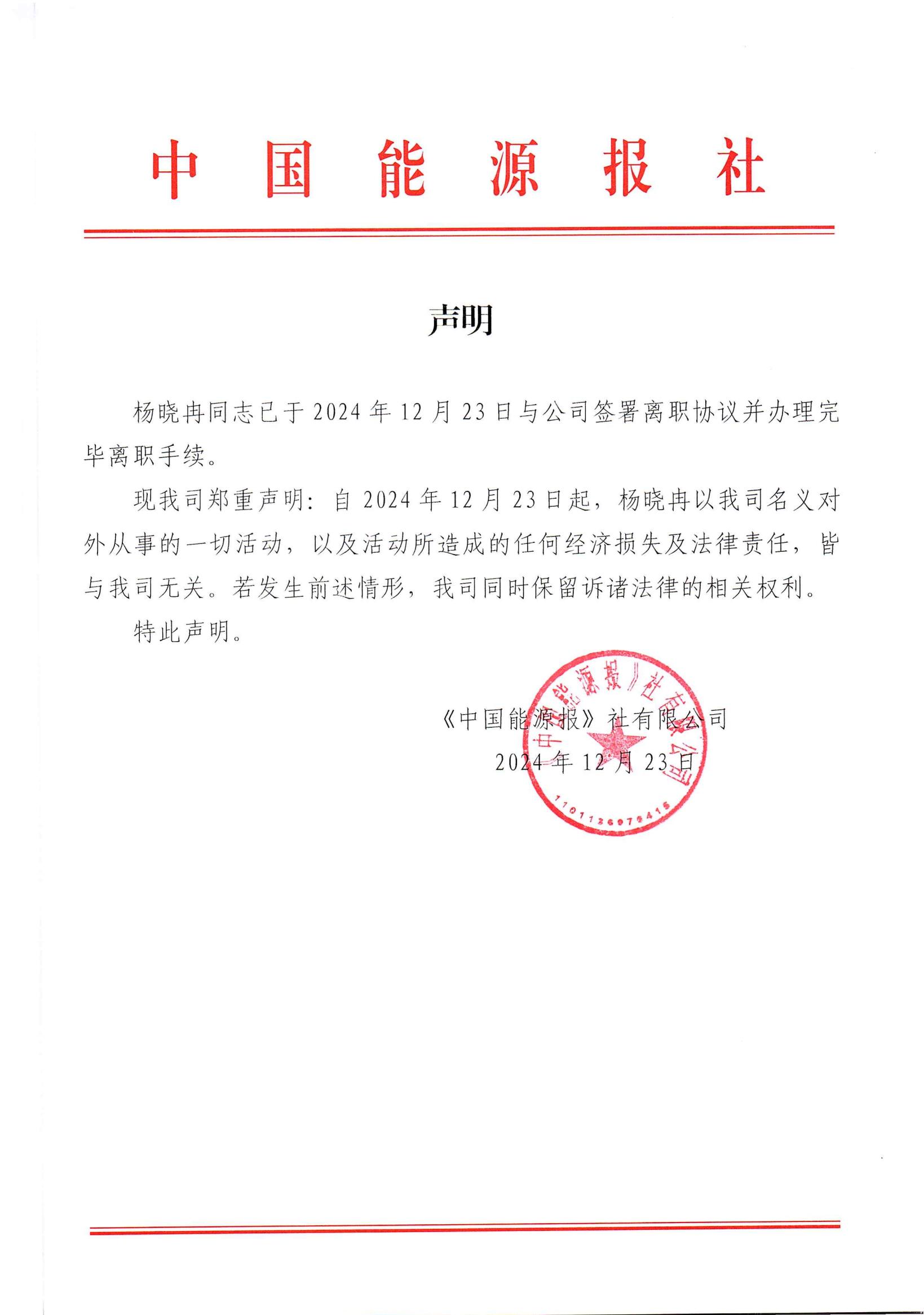 【声明】中国能源报社关于杨晓冉同志的离职声明