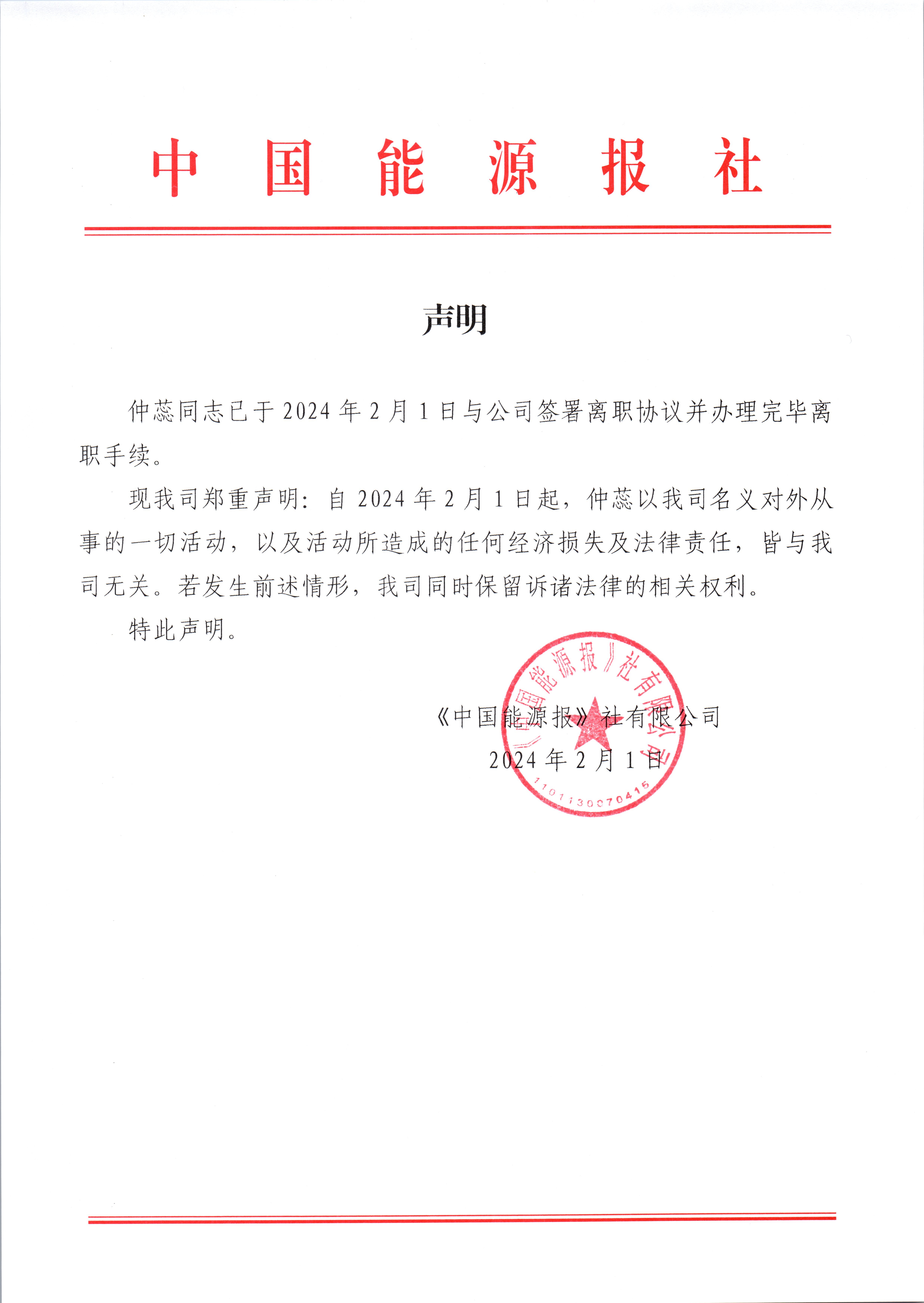 【声明】中国能源报社关于仲蕊同志的离职声明